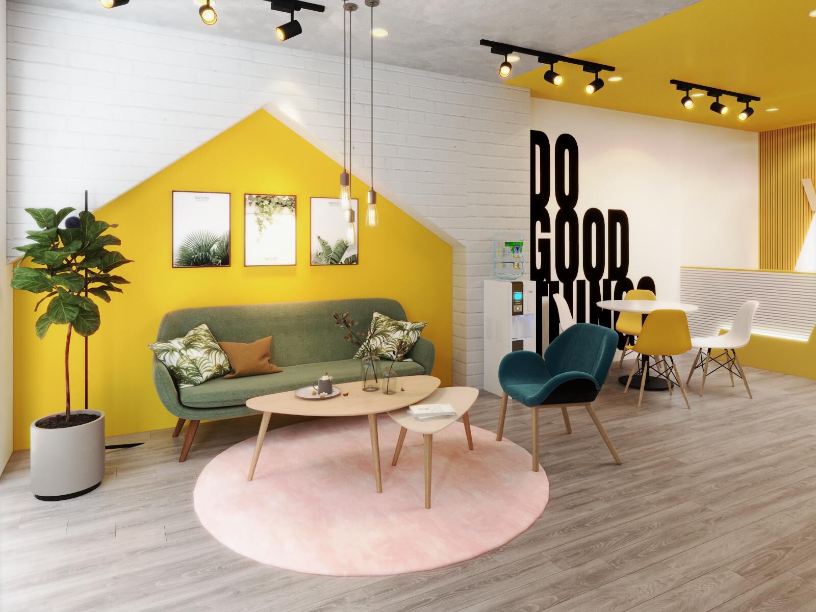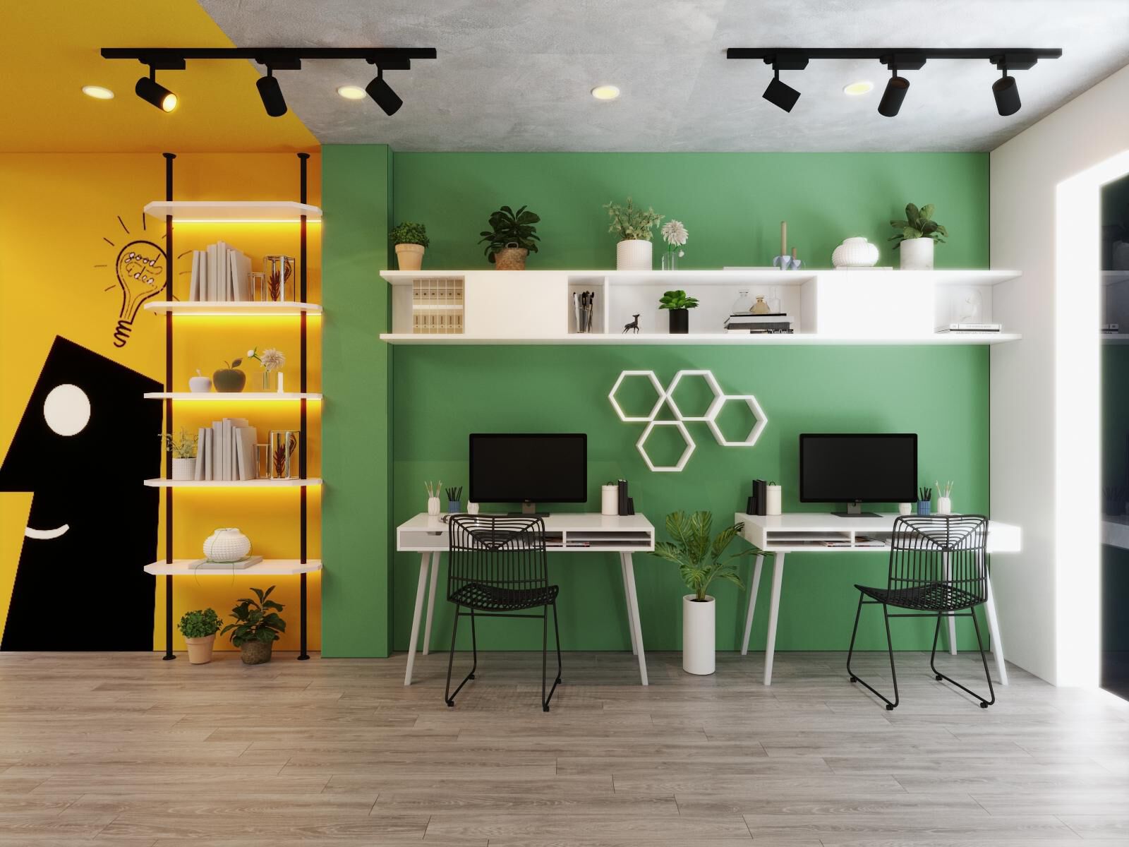 | Thoạt nhìn, không gian văn phòng toát lên vẻ trẻ trung, tươi mới và tràn đầy năng lượng bởi sự kết hợp ăn ý giữa các màu sơn tường xanh lá, vàng chanh trên phông nền trắng – xám. |