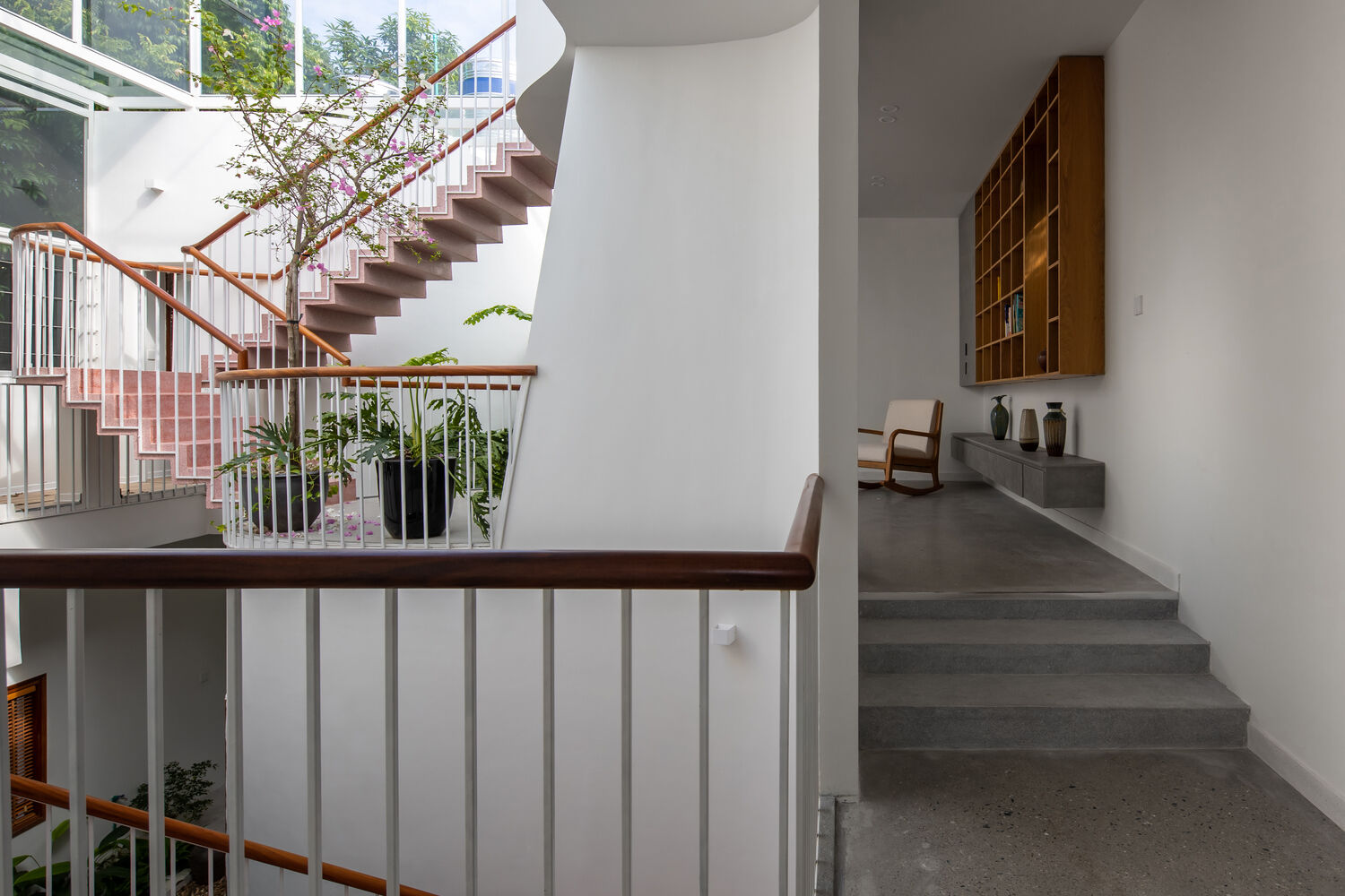 | Cầu thang ngoài trời ở khu vực lõi trung tâm, kết nối các không gian nhà với nhau. Đây cũng chính là điểm nhấn kiến trúc ấn tượng. |