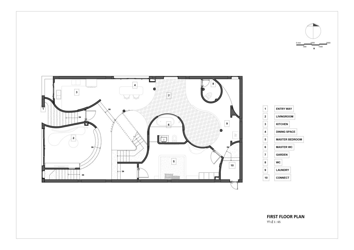 Mỗi vị trí trong căn nhà tạo nên một góc nhìn khác nhau, được bố trí có ý đồ nhằm tạo nên bức tranh thú vị. Kiến trúc sư bố trí các không gian chức năng bám theo đường uốn lượn để tối đa hóa được sự kết nối giữa trong và ngoài, giữa đặc và rỗng, giữa con người với thiên nhiên.
