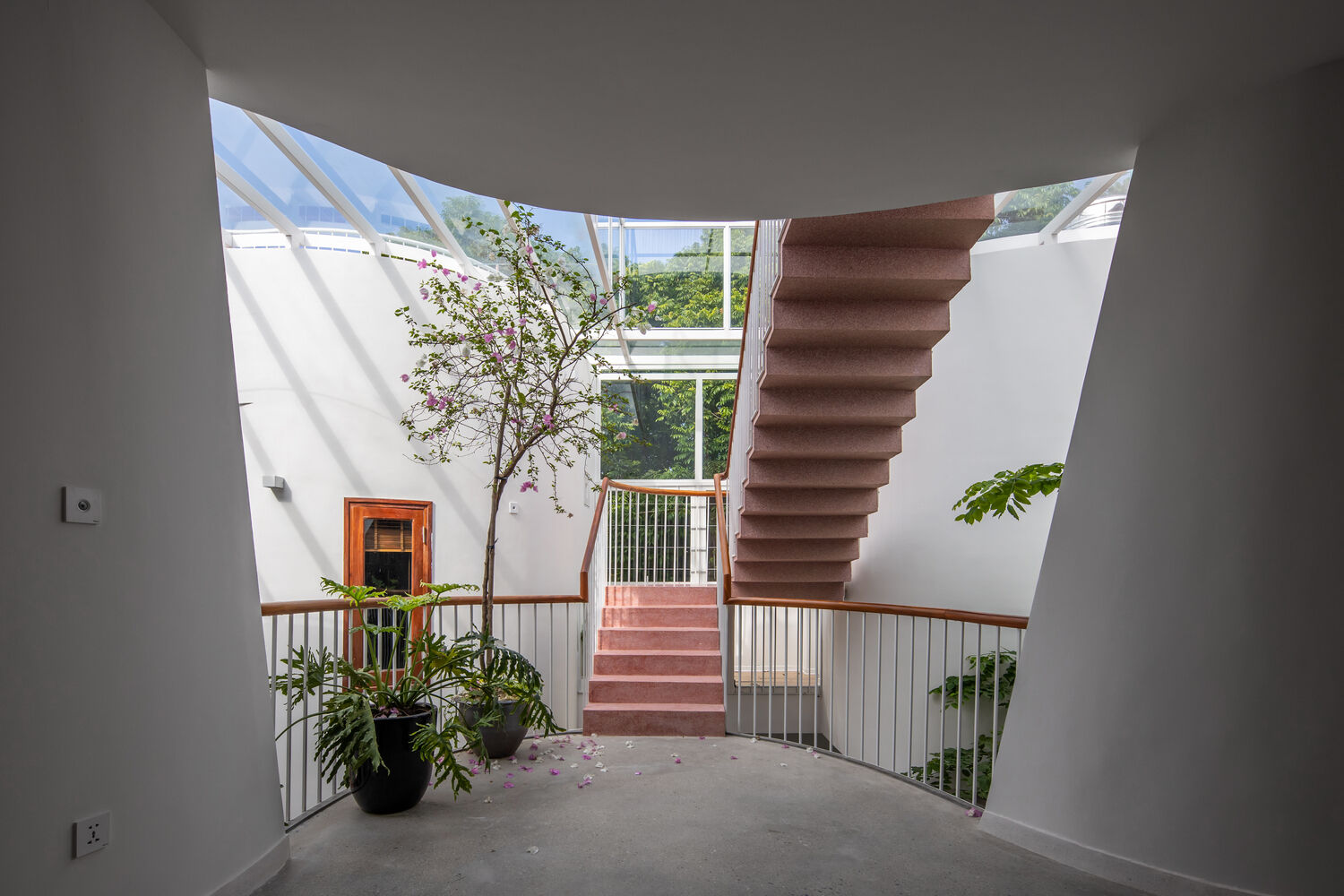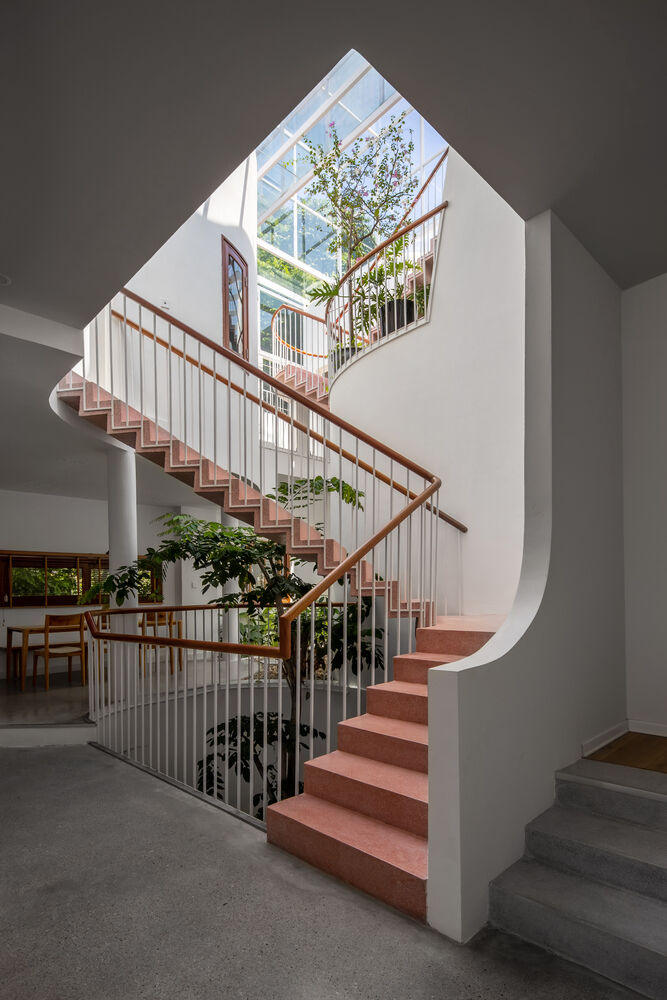 | Nội thất uốn lượn hài hòa với cấu trúc tường nhà. Ô cửa sổ kính mở ra lõi trung tâm với nhiều nắng gió, cây xanh. |
