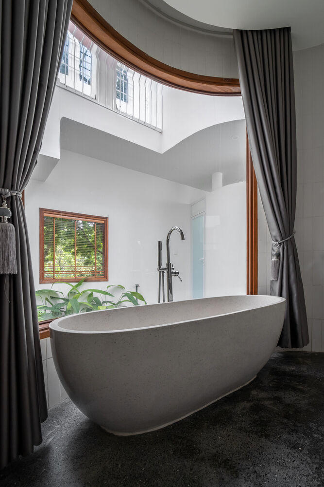 | Phòng tắm với tầm nhìn rộng mở ra khoảng sân vườn xanh mát bên ngoài. |