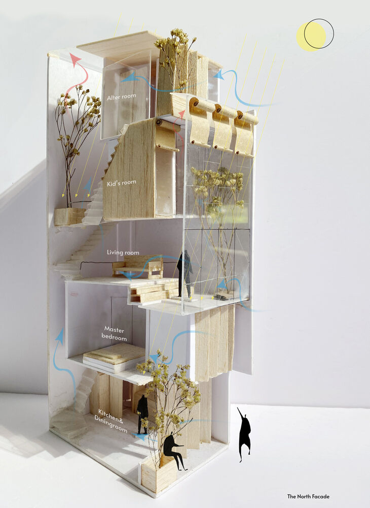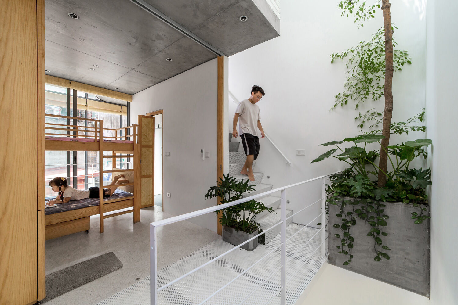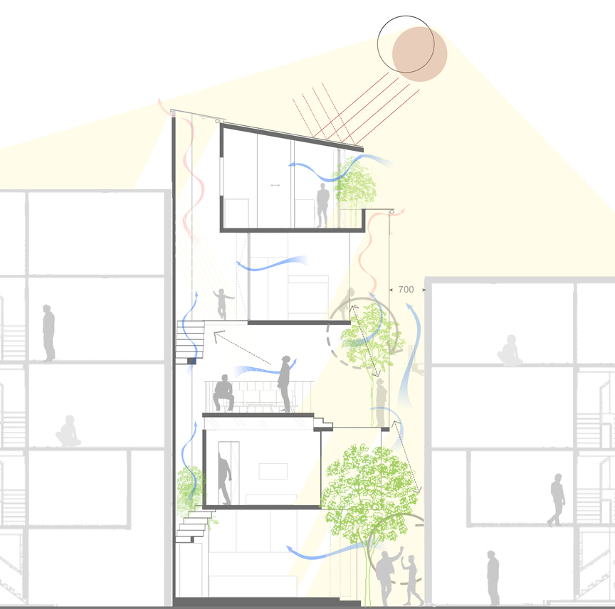 Ngôi nhà ống 5 tầng hẹp ngang tận dụng tối đa ánh sáng tự nhiên vào ban ngày và thông gió tự nhiên tối ưu. Các mảng xanh được đưa vào nhà một cách khéo léo, trong khi đó, thiết kế liên thông không gian các tầng giúp các thành viên gia đình tương tác, kết nối nhiều hơn. Thiết kế của ngôi nhà cũng đề cao mối quan hệ gia đình truyền thống của người Hà Nội.