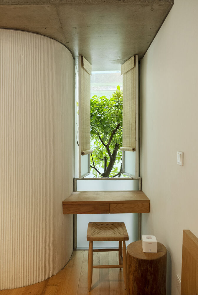 | Góc đọc sách, làm việc nhỏ xinh, hướng nhìn ra khoảng giếng trời xanh mát, ngập tràn nắng gió. |