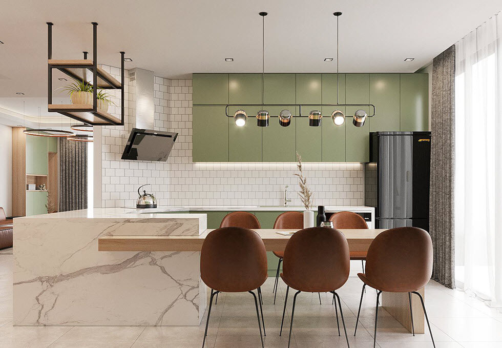 | Tường và tủ bếp sơn màu xanh lá cây tương phản nhẹ nhàng với sắc trắng của trần, sàn và ghế ăn màu nâu đất. Sự hòa quyện của những màu sắc này tạo cảm giác ấm cúng, hiện đại. |