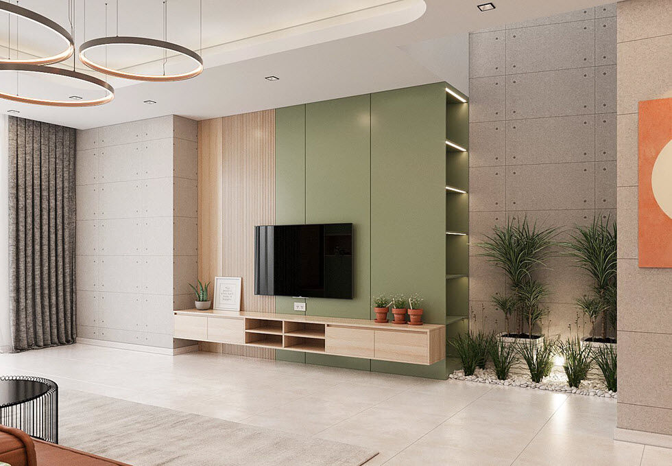 | Xuyên suốt ngôi nhà này, kiến trúc sư sử dụng tông màu trắng, xám trung tính làm màu nền để làm nổi bật nội thất màu nâu đất và những điểm nhấn màu xanh lá cây tươi sáng. Màu sắc được biến tấu theo từng không gian chức năng khác nhau. |