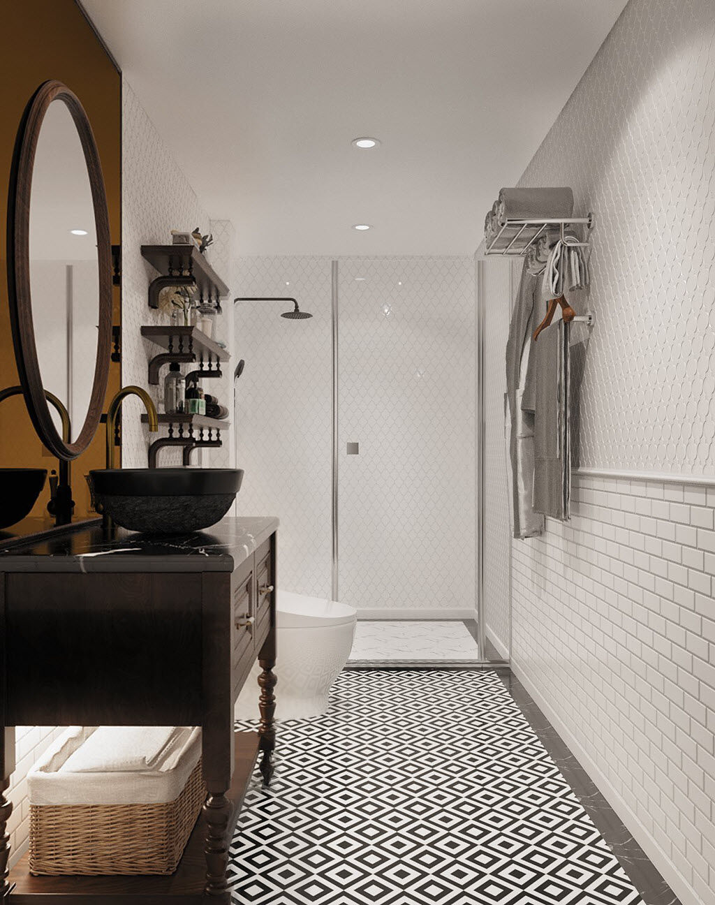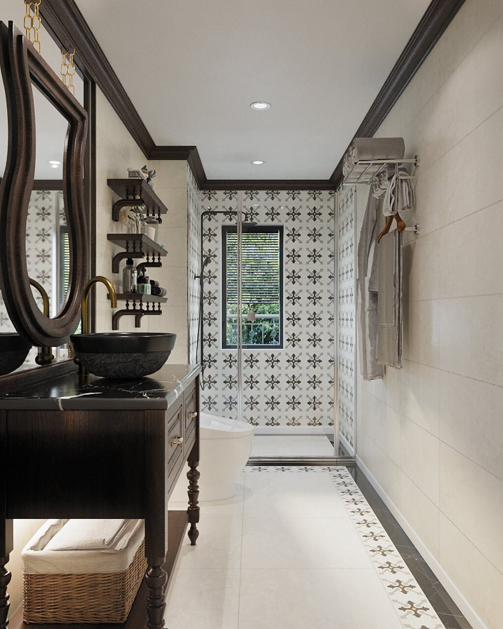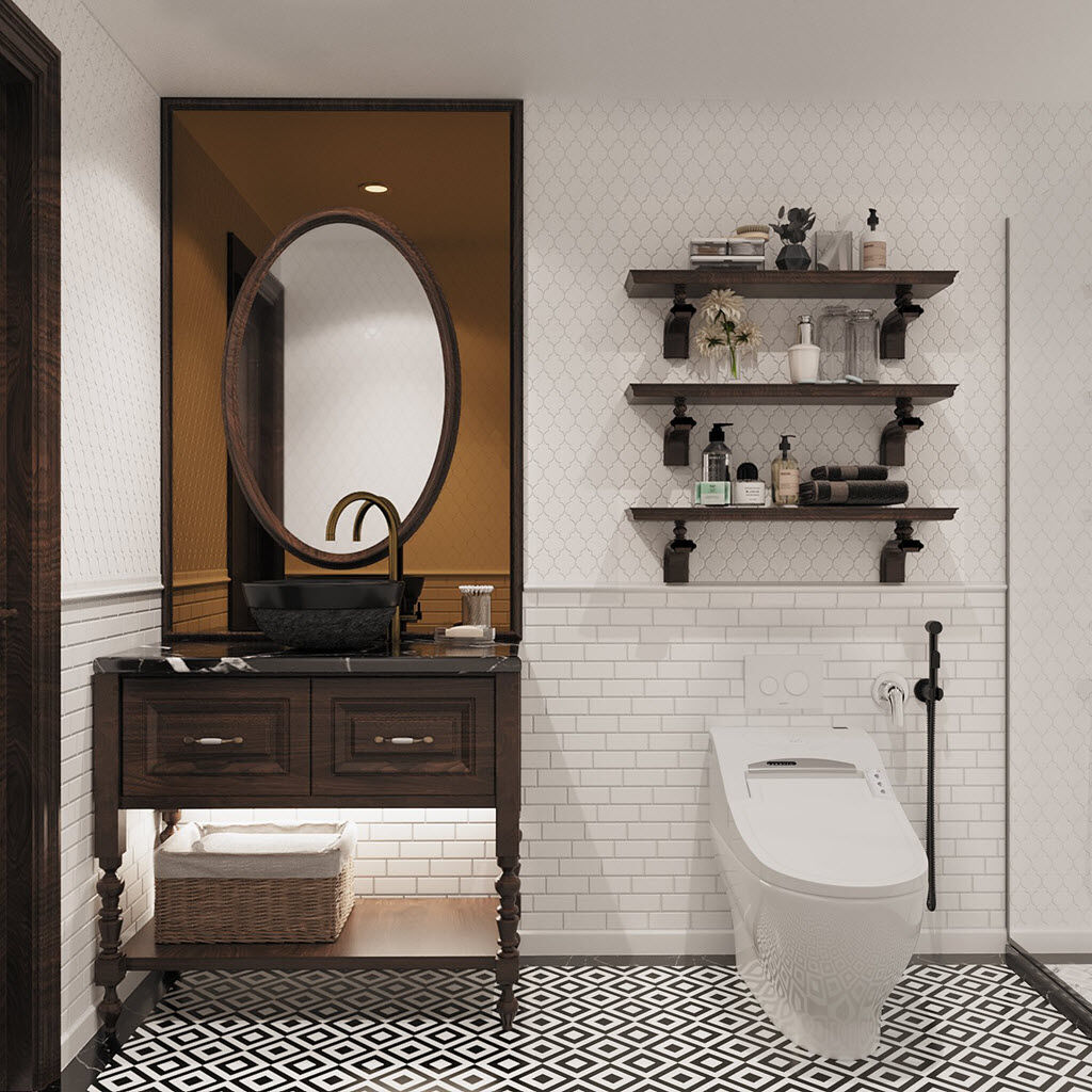 | Phòng vệ sinh phong cách Indochine sang trọng và thoáng đãng với tủ lưu trữ, kệ mở gắn tường gọn đẹp. |