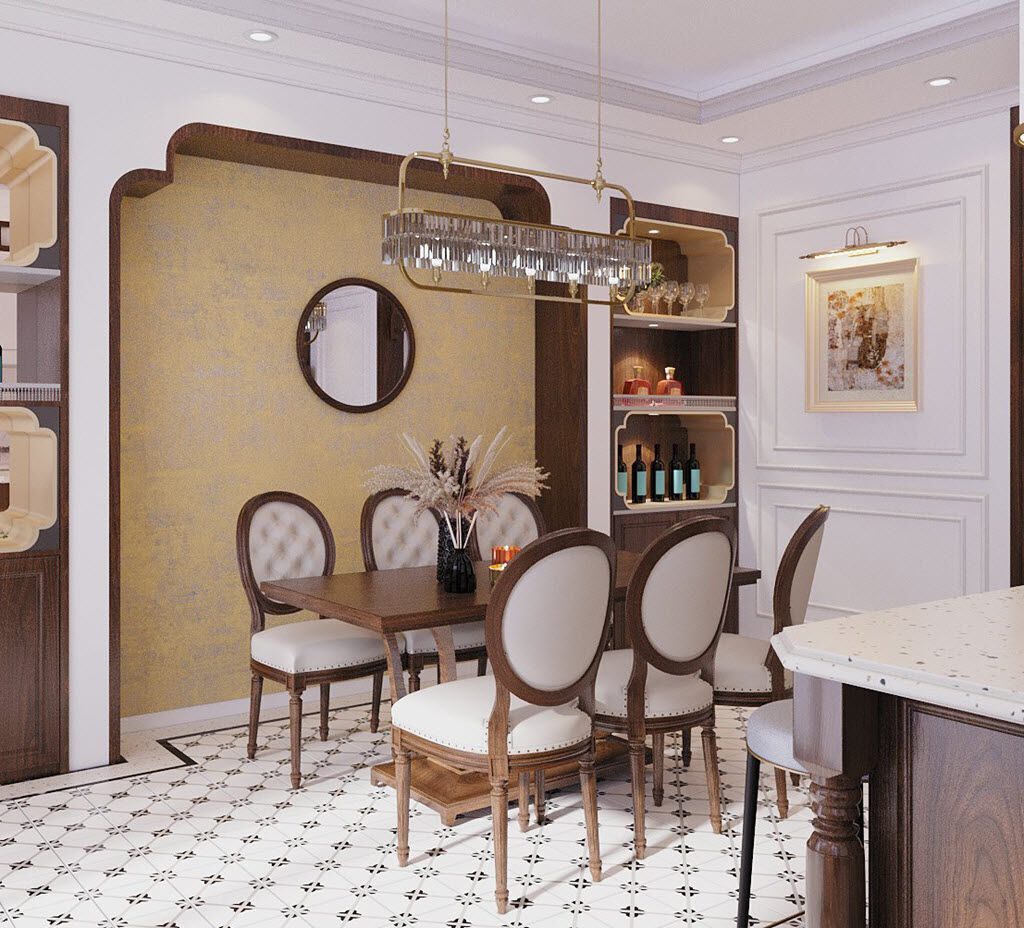 | Gương tròn gắn trên nền tường decor giấy dán màu vàng đồng có họa tiết như một điểm nhấn duyên dáng cho không gian bếp + ăn. |