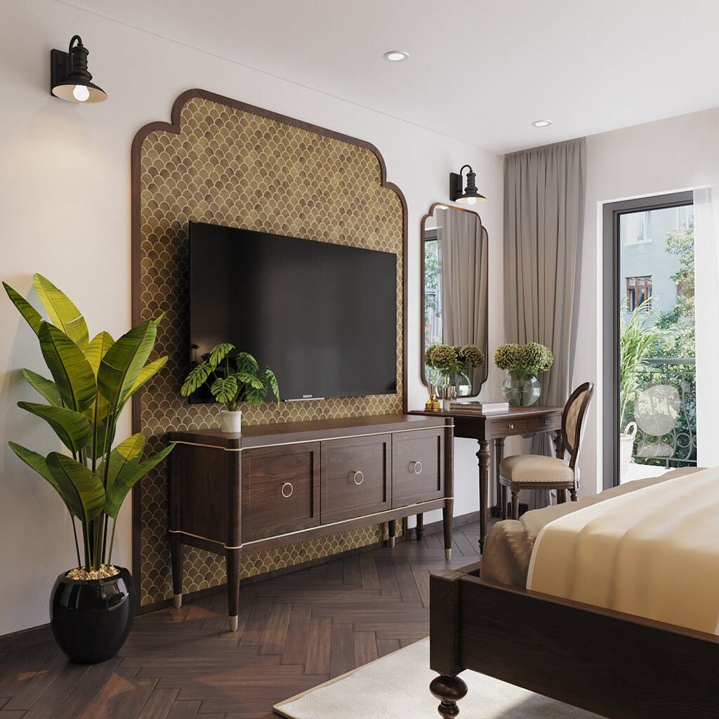 | Tủ kệ tivi cùng tông màu với sàn gỗ xương cá, giường và bàn ghế, khung gương trang điểm tạo thành một thể thống nhất hài hòa. Những chậu cây xanh trở thành điểm nhấn tươi mới, tràn đầy sức sống. |