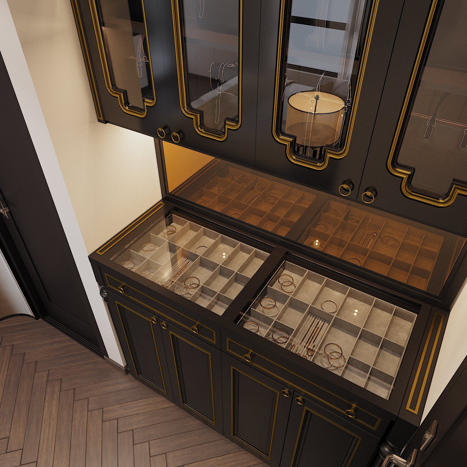 | Tủ kính lưu trữ phụ kiện thời trang của gia chủ. |