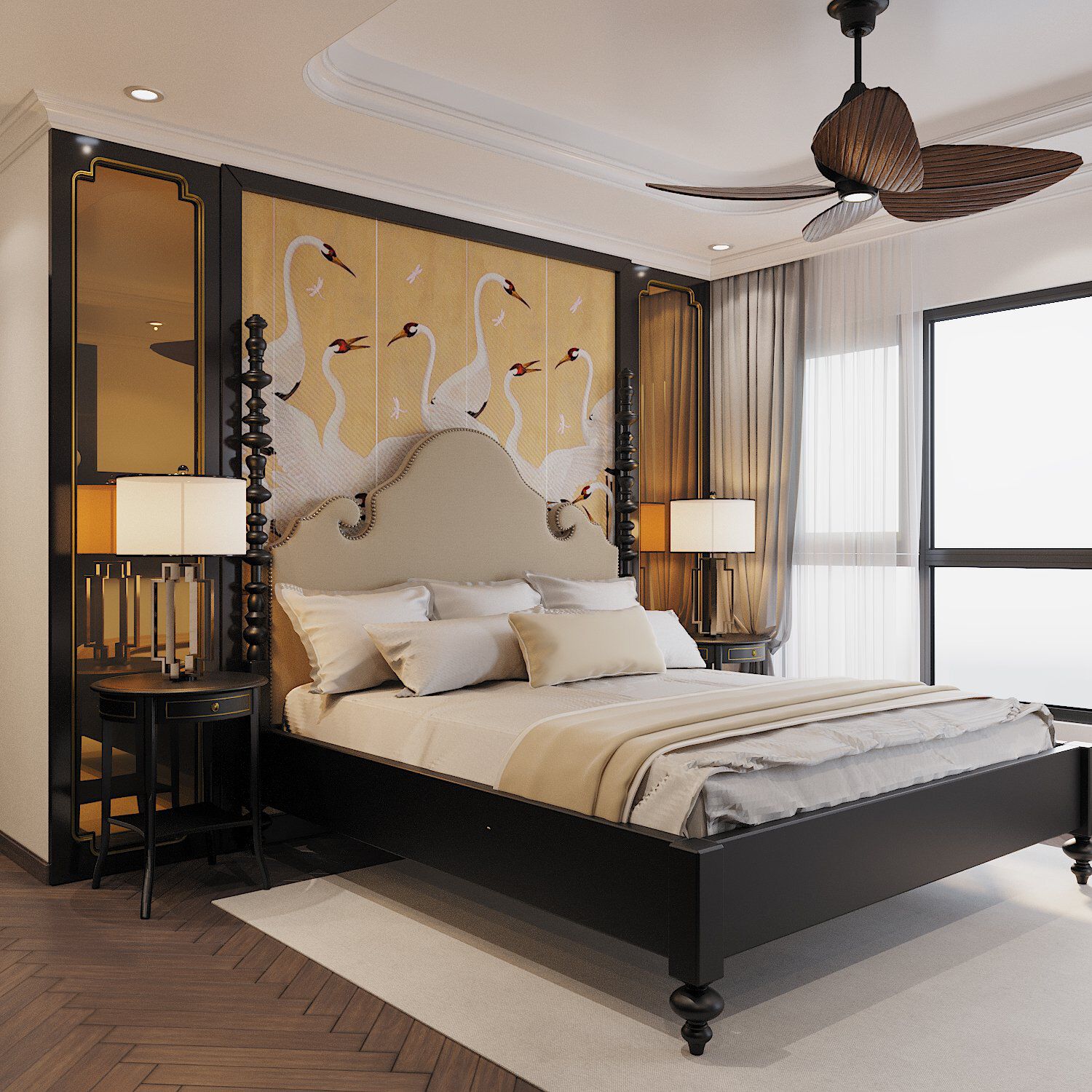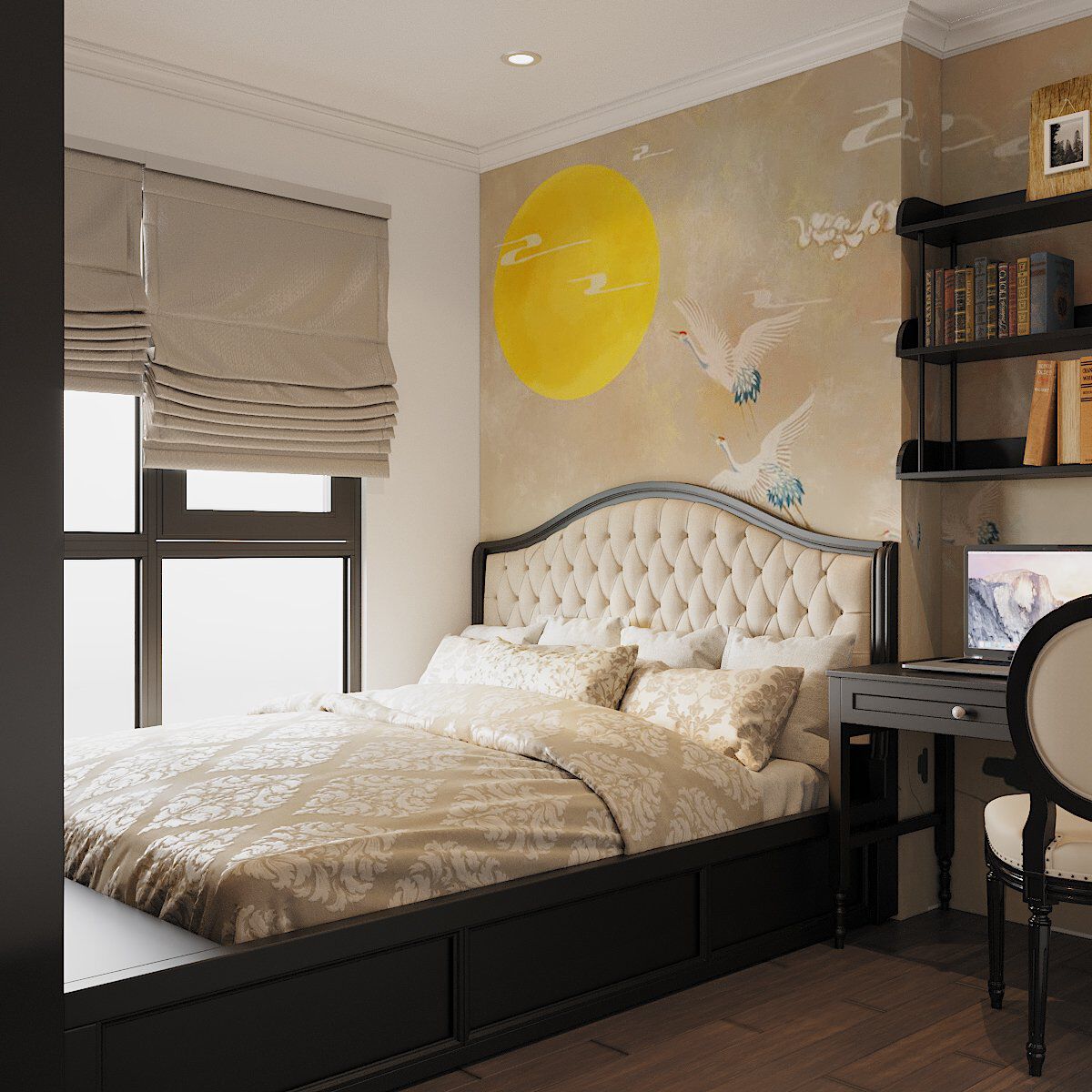 | Hình ảnh cánh hạc sải cánh bay về phía mặt trời tạo điểm nhấn hút mắt trong phòng ngủ này, mang lại cảm giác bình yên, thư thái. |