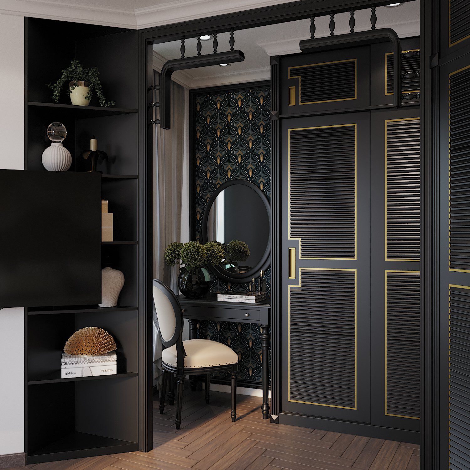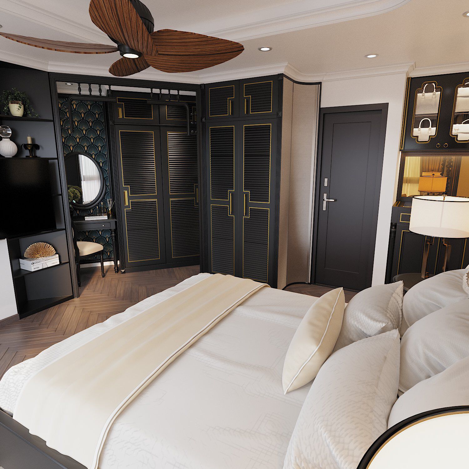 | Tủ quần áo màu đen với các đường kẻ màu vàng đồng nổi bật giúp gia tăng chiều sâu cho không gian ngủ nghỉ. |