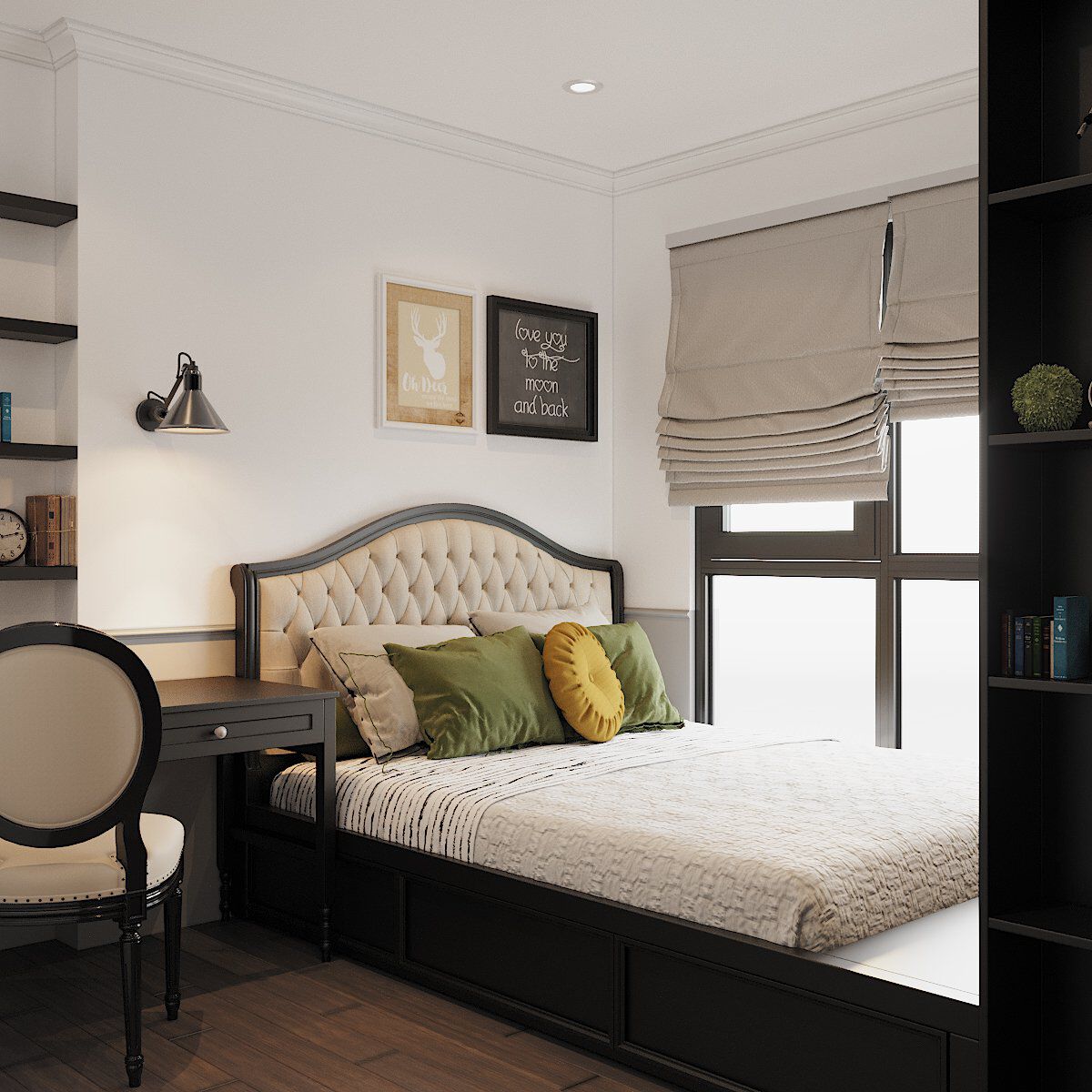 | Phòng ngủ thứ ba có thiết kế trẻ trung, năng động hơn. Căn phòng tích hợp góc làm việc tại nhà nhỏ gọn và tiện dụng. |