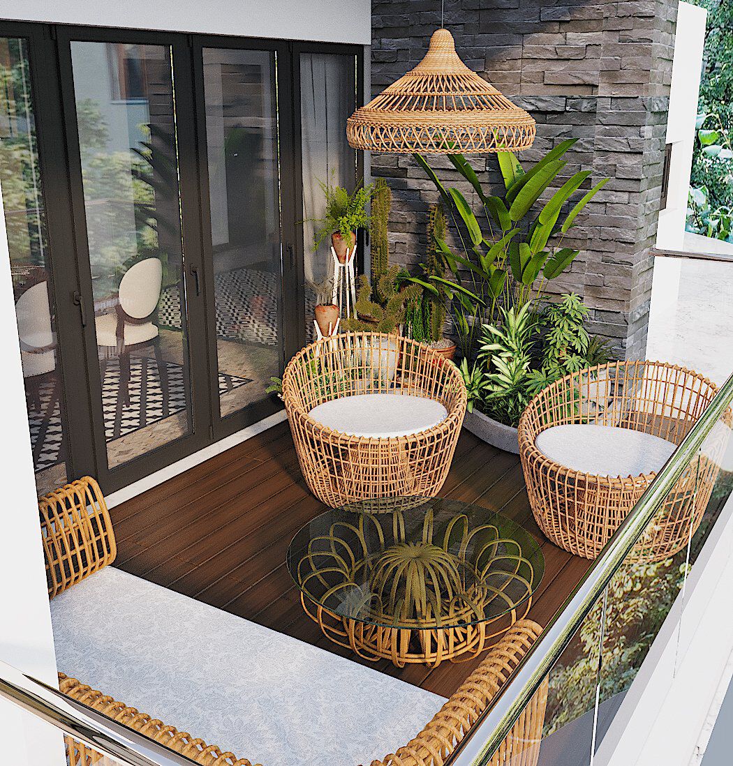 | Góc thư giãn ngoài trời lý tưởng nơi ban công căn hộ với bộ bàn ghế chất liệu mây tre đan mộc mạc, gần gũi. |