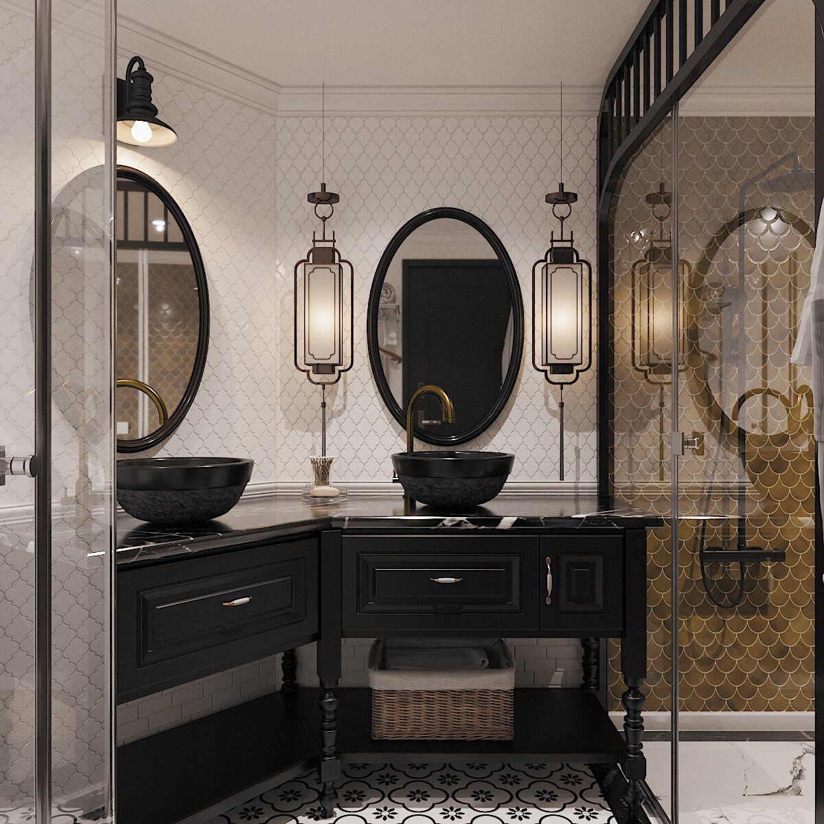 | Phòng tắm “sang chảnh” trong phòng ngủ master. Gạch ốp lát màu vàng đồng dạng vảy cá xếp lớp định vị khu vực tắm bồn. |