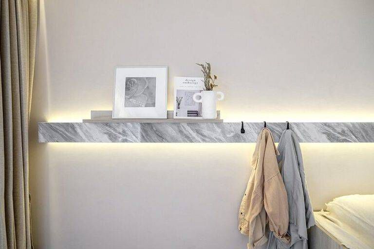 | Kệ nổi mỏng bằng đá cung cấp thêm không gian lưu trữ trong căn hộ nhỏ. |